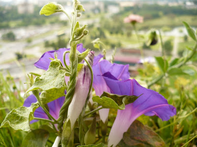Вначале лета успешно ринулись в рост вьюнки - название которых мне запомнить не удаётся (впрочем остальных цветов я тоже не знаю).