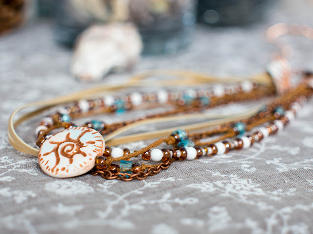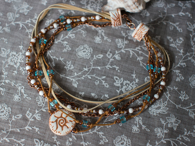 Солнечная тема в этом году не отпускала меня долго, поэтому в кулону я собрала очень весёлый браслет в стиле бохо.